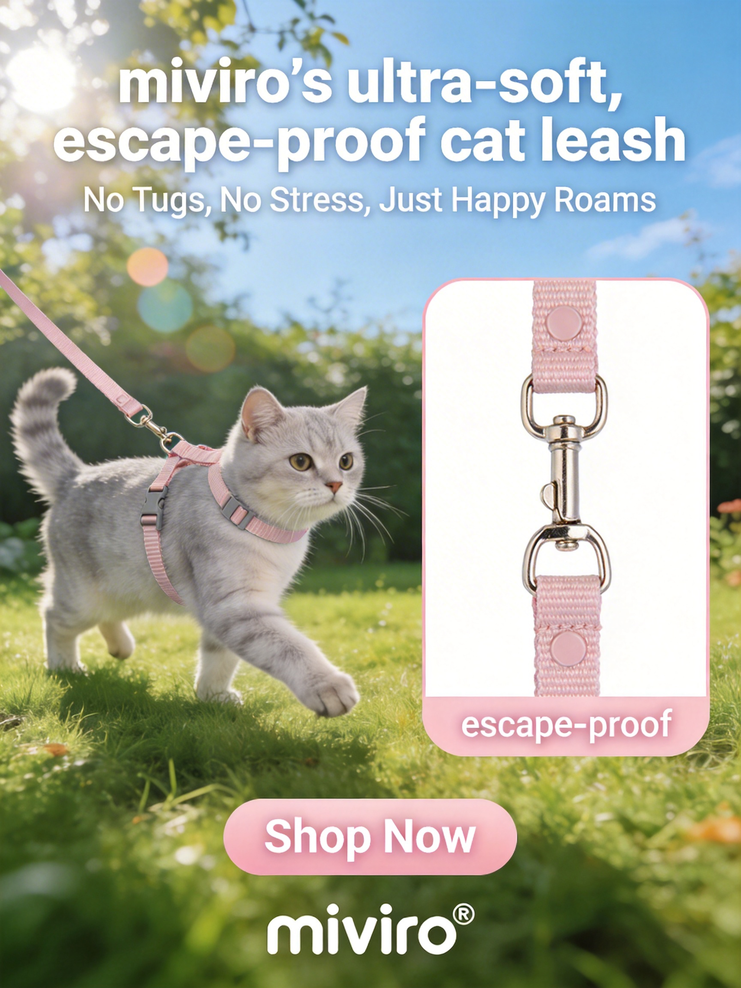No Tugs, No Stress, Just Happy Roams | miviro’s ultra-soft, escape-proof cat leash is crafted for your curious feline: wander confidently outdoors in total comfort, free from tugging struggles and escape risks, turning every outing into a worry-free, joyful adventure. Shop Now